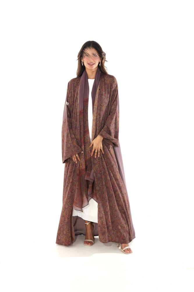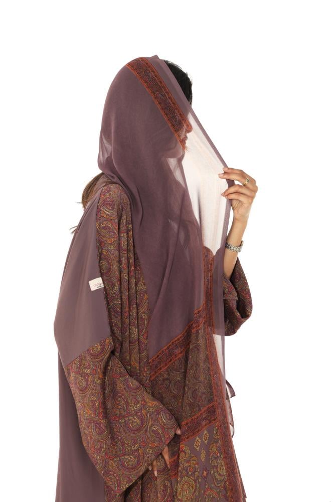 عباية أنيقة جداً تحمل لون (غبار الورد) من الألوان الدافئة والمريحة للعين, حًرصت عشوقه ان تصمم العباية بإضافة زخارف ونقوش ذهبية وأرجوانية التي تضيف المسة الإبداعية على العباية.